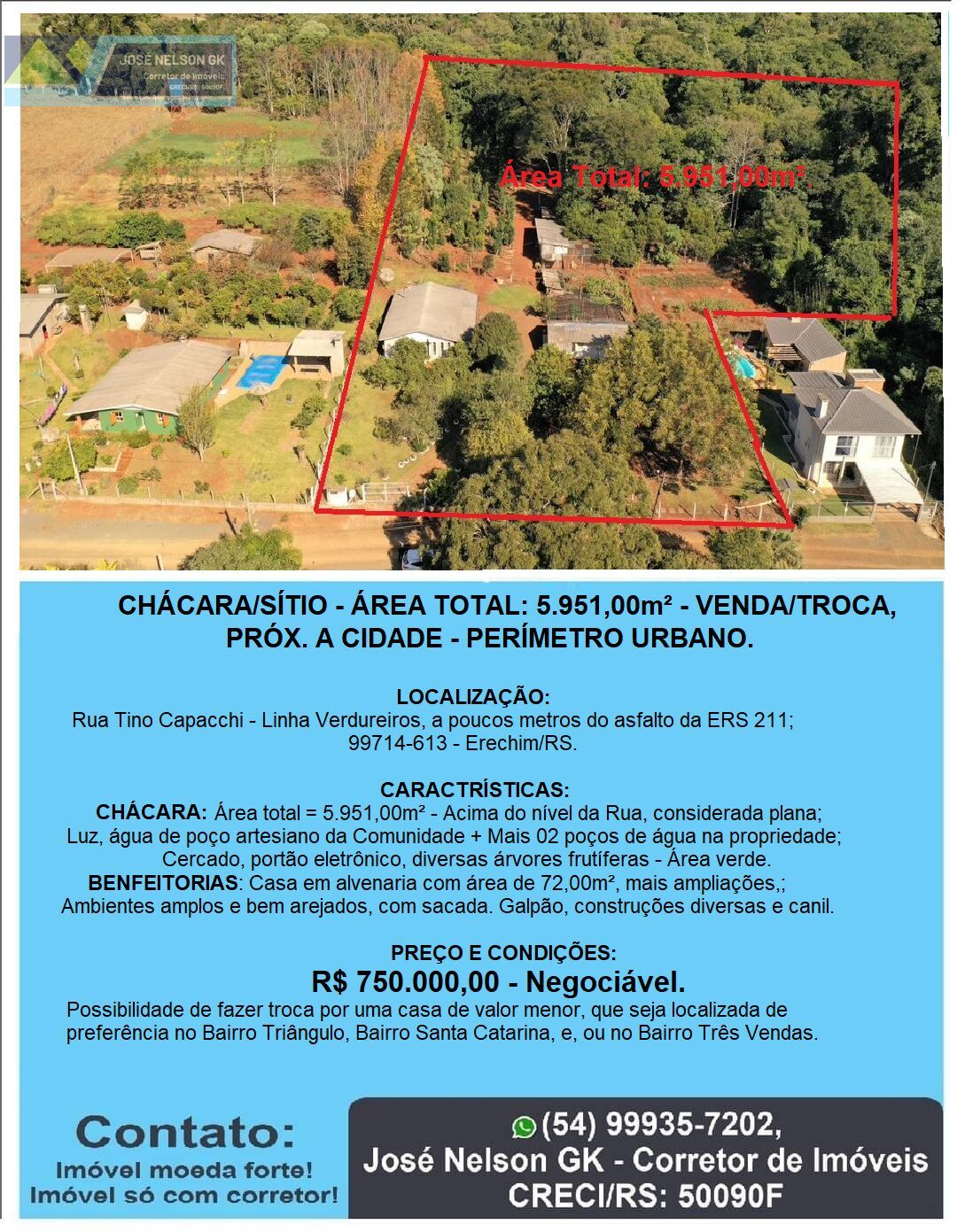 CHÁCARA/SÍTIO - ÁREA TOTAL: 5.951,00m² - VERDUREIROS - ERECHIM/RS